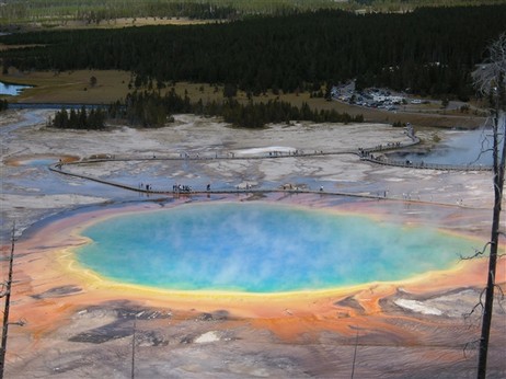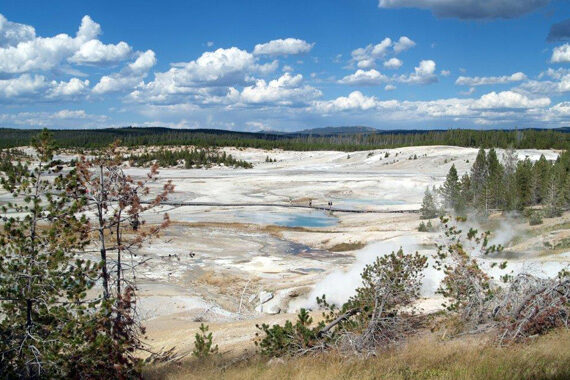 Fra le cose viste e che mi sono rimaste negli occhi e nel cuore il Norris Geyser Basin: si potrebbe credere di trovarsi dovunque, tranne che nel nostro pianeta: a 2281 metri di altitudine questo bacino contiene le sorgenti e i geyser più caldi del parco; più che da ogni altra parte si sente l’onnipresenza delle tenebre che brontolano sotto la sottile crosta terrestre. Solo i diversi sentieri attrezzati con passerelle di legno permettono di avvicinarsi a questi sorprendenti fenomeni naturali.Le alghe che vivono nelle piscine calde hanno colorato il travertino con sfumature di marrone, arancione, rosso e verde!