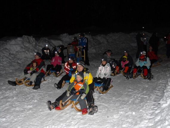 – Di notte, con le ciaspole ai piedi e muniti di torcia frontale si può ammirare il tramonto o la luna rispecchiarsi nella neve … e perchè non ritornare per un po’ bambini lasciandosi trasportare a bordo di un fuoristrada fino in cima al monte e poi uno spintone allo slittino e … giù, lungo la pista illuminata al chiaro delle fiaccole!!